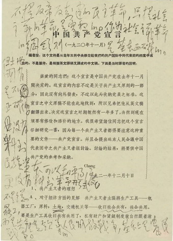 《中国共产党宣言》没有散发到社会上去,而是作为建立组织、收纳党员的标准。《宣言》是1921年根据英文稿转译成中文的,保存在中共驻共产国际代表团的档案里,1957年苏共中央移交给中共中央。1958年6月,毛泽东在登载于中共中央秘书局同年6月3日编印的《党史资料汇报》第1号上的《中国共产党宣言》上批注:“不提反帝反封建的民主革命,只提社会主义的革命,是空想的。作为社会主义革命的纲领则是基本正确的。但土地国有是不正确的。没有料到民族资本可以和平过渡。更没有料到革命形式不是总罢工,而是共产党领导的人民解放战争,基本上是农民战争。”